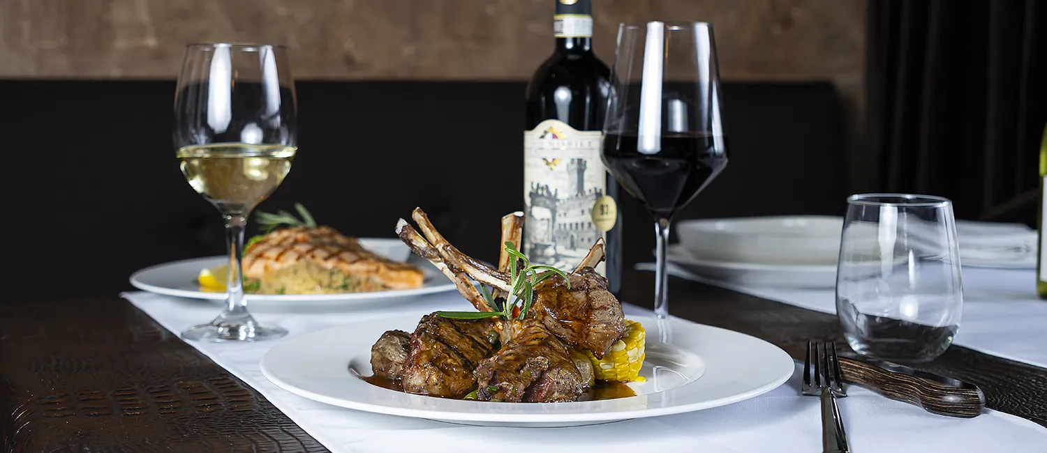 grilled rack of fresh Ontario lamb with capers red wine balsamic reduction served with potatoes and seasonal vegetable