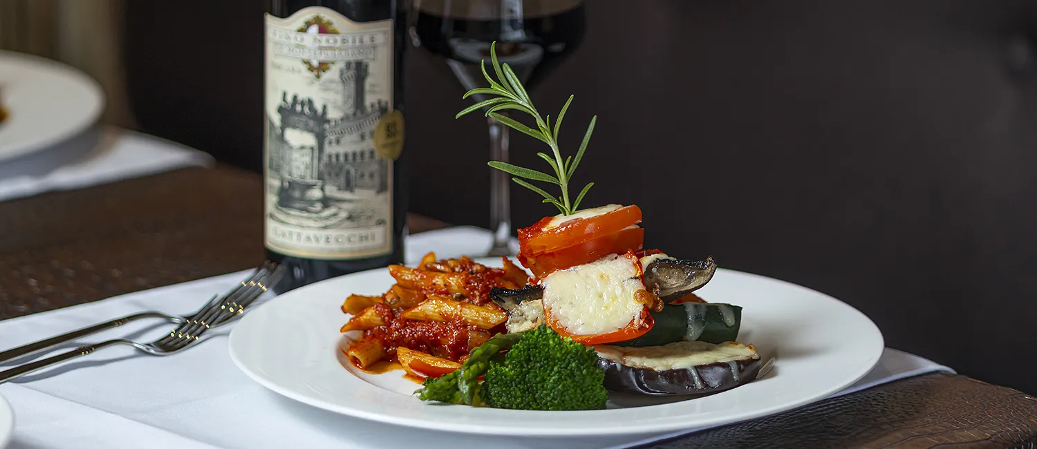 grilled vegetable pyramid of eggplant, zucchini, red peppers, Portobello mushroom, tomato, with goat and Bocconcini cheeses, served with penne tomato sauce